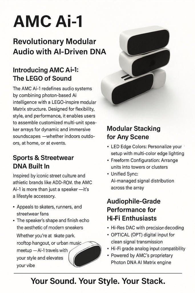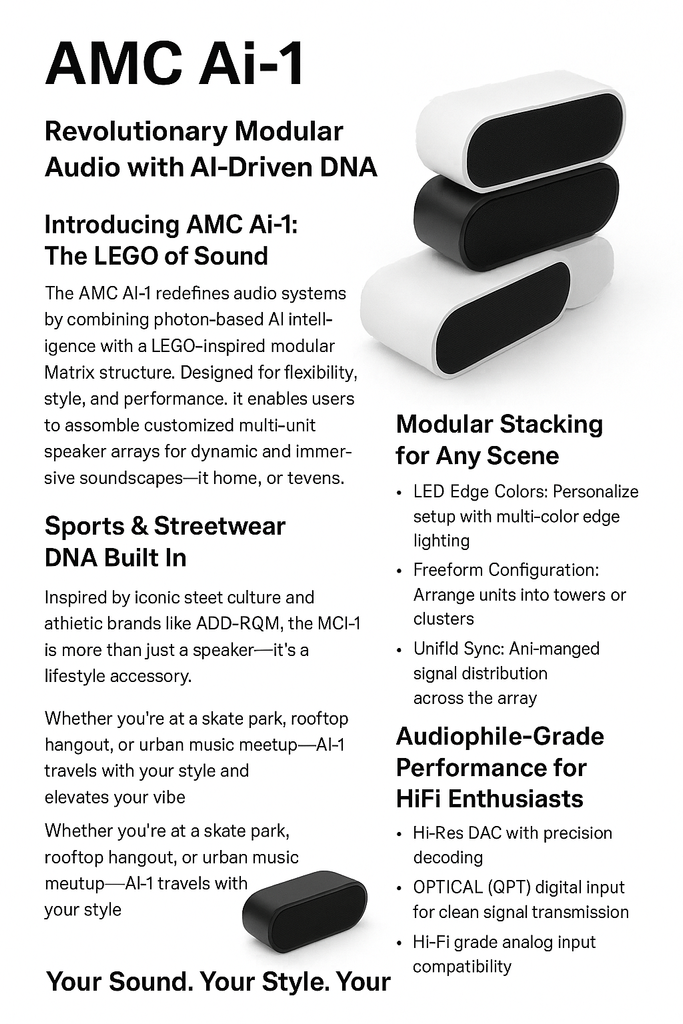 The AMC Ai-1 redefines audie systems by combining photon-based Ai intelligence with a LEGO-inspire mdular Matrix structure. Designed for flexibility, style, and purformance, it enables users to assemble customized multi-unit spea- ker arrays for dynamic and immersive soundscapes -whether indoors outdo- ors, at home, or at events.